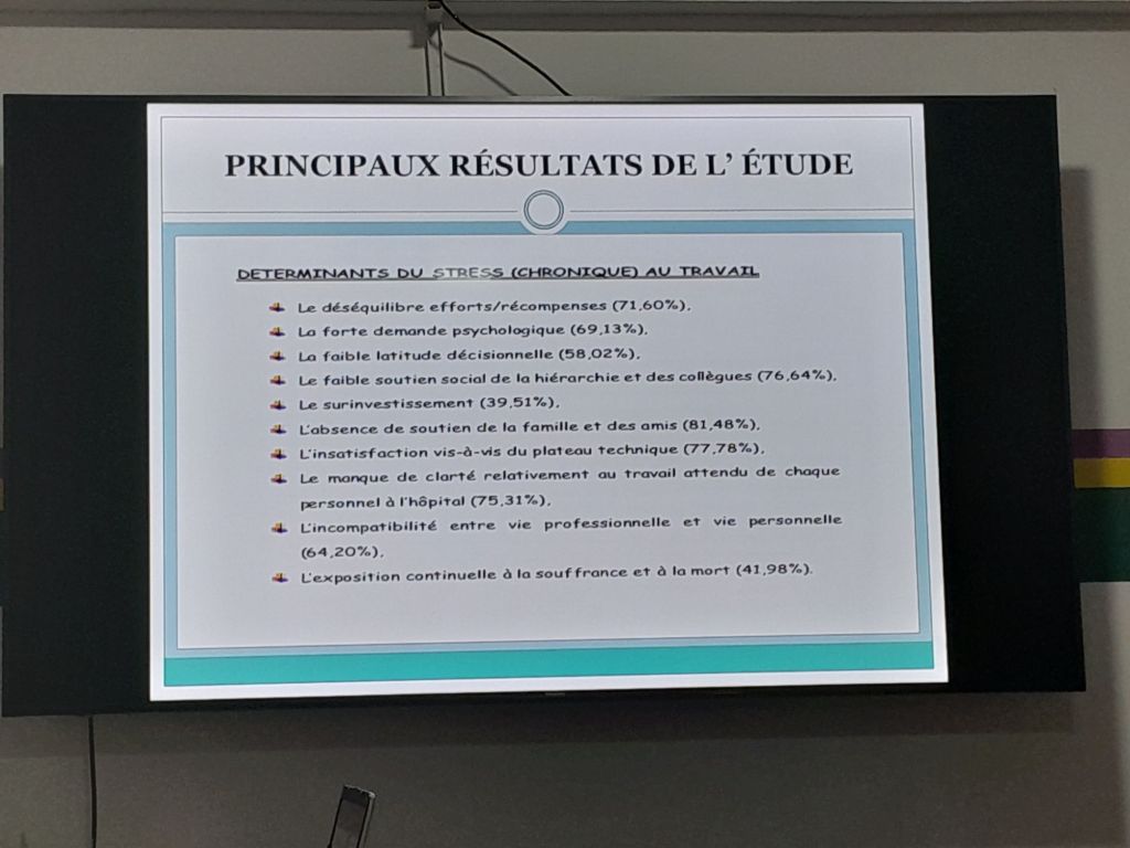 À travers une autre étude qui date de 2021 menée par le médecin bucco-dentiste, passionnée de la promotion de la santé en général et de la santé mentale en particulier, Dorothée Maa,il ressort que 62, 96% des médecins interrogés ont une exposition au stress émanant du job strain et iso strain et 71,60 % sont exposés à un stress associé au Déséquilibres Efforts-Récompenses.